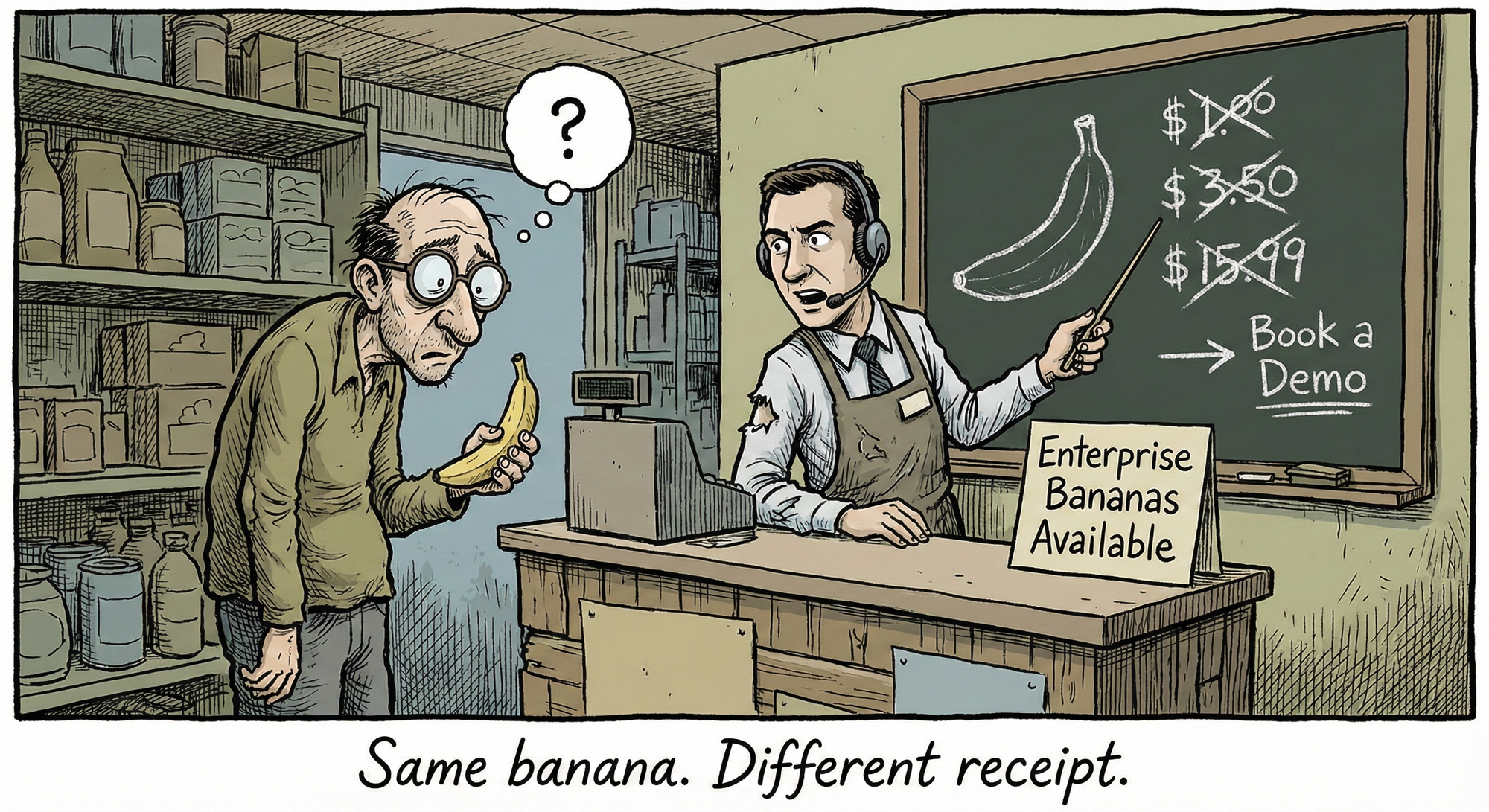 You're the bodega that doesn't list prices and just vibes it based on foot traffic. Bananas today? $1. Tomorrow? $32. Yesterday was free but you had to attend a webinar. Next week there's an enterprise tier for bananas. Same banana. Different logo on the receipt.