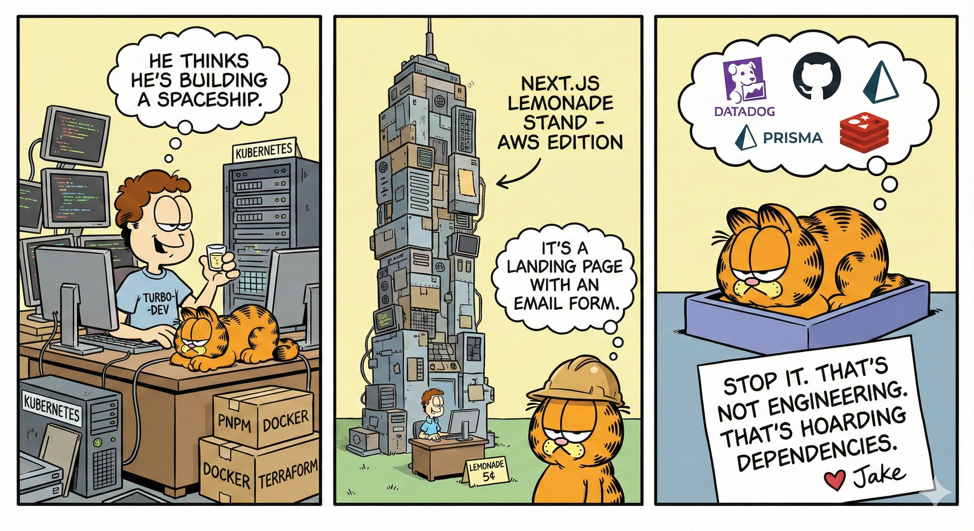(I've seen a static HTML page—three sentences, one image—deployed via a monorepo with TypeScript, Prisma, Redis, and a GitHub Actions workflow longer than a CVS receipt. The README had an "architecture decisions" section. For a page that could've been index.html and a mailto link.)