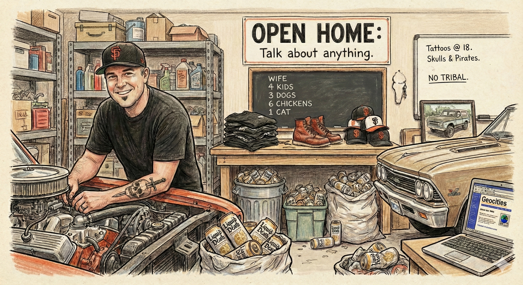 1 Wife, 4 Kids, 3 Dogs, 6 Chickens, 1 Cat, 1 Cow (soon), 45 Black Shirts, 2 Pairs Of Red Wing Boots, 6 SF Giants Hats, 2988493 Empty Liquid Death Cans.