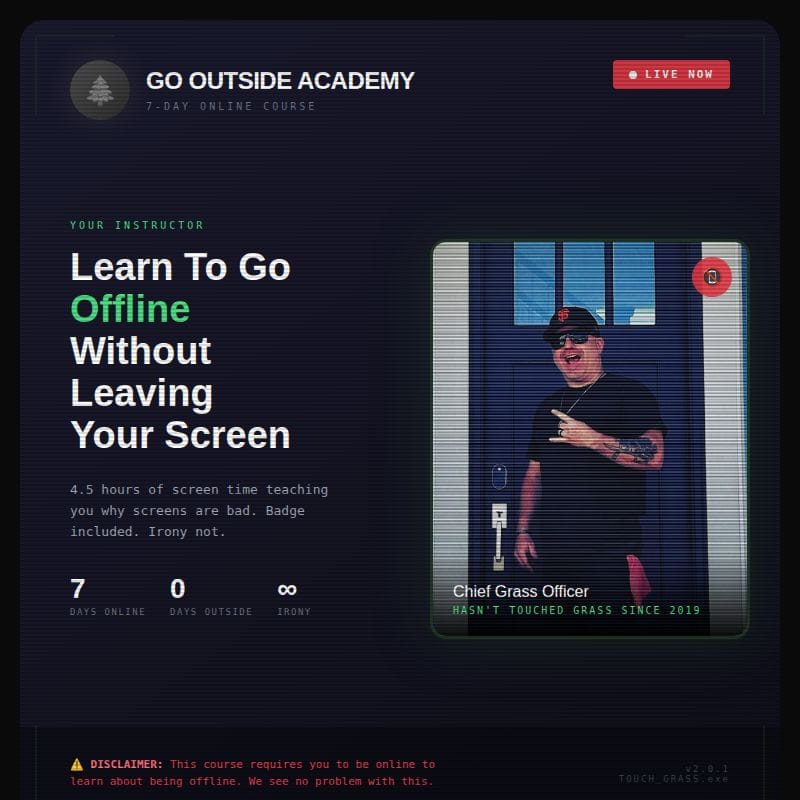 For 7 days, your kid logs into their tablet. Opens an app. Watches me explain why they should go outside and touch grass.