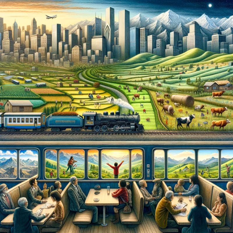 "In our subconscious lies a vivid dream of a cross-continental journey by train. We envision scenes of life: highways bustling with cars, children waving at crossings, grazing cattle, billowing smokestacks, endless fields of crops, diverse landscapes, and urban skylines.