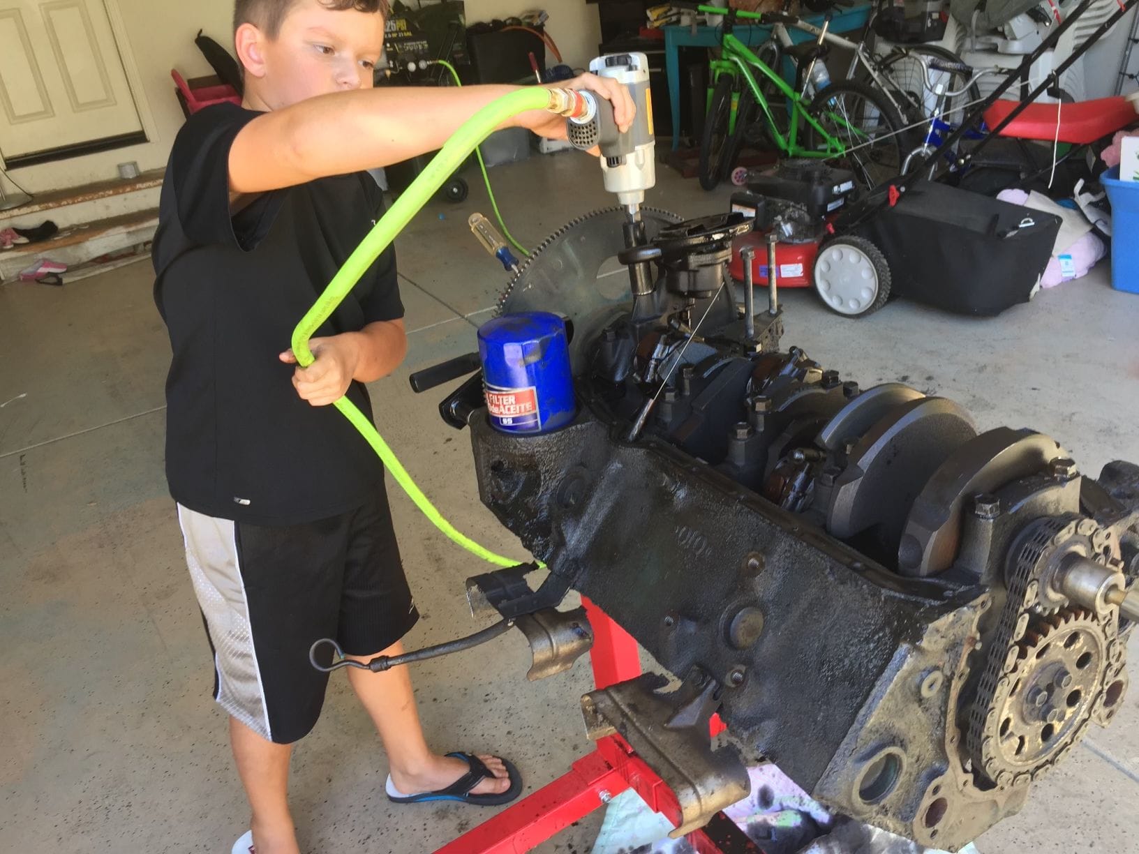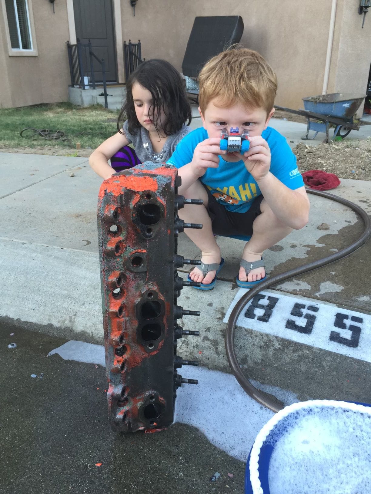 Photos: 2014, Tyler, our oldest, helping take apart a Small Block Chevy. We rebuilt this together, and everyday he got home from school, he would ask me if we could work on it. He wrote in his journal how much he loves "working on the engine". Brooklyn and Travis "helping" clean a cylinder head.